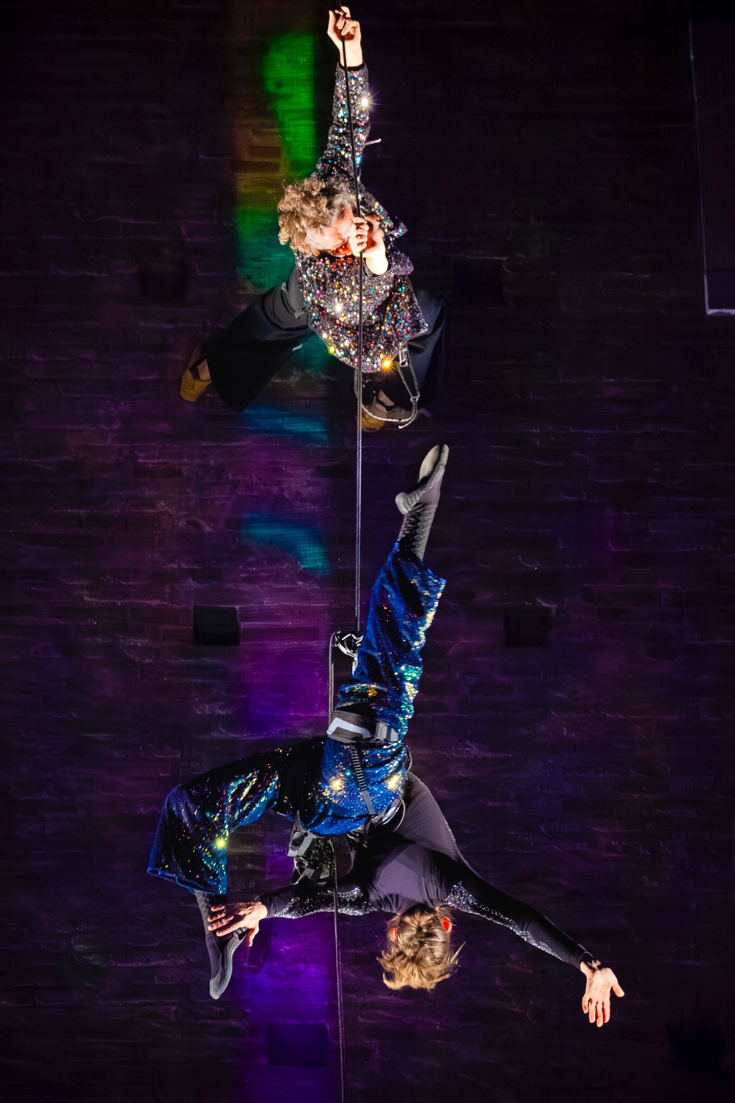 Sullo spazio verticale l'attore, il performer, il circense si muovono come fossero su un pavimento ruotato di 90°, un palco ortogonale mentre nelle perfomance aeree si va nell'ambito del sospeso, del testa in giù, della perdita totale dei riferimenti spaziali.
